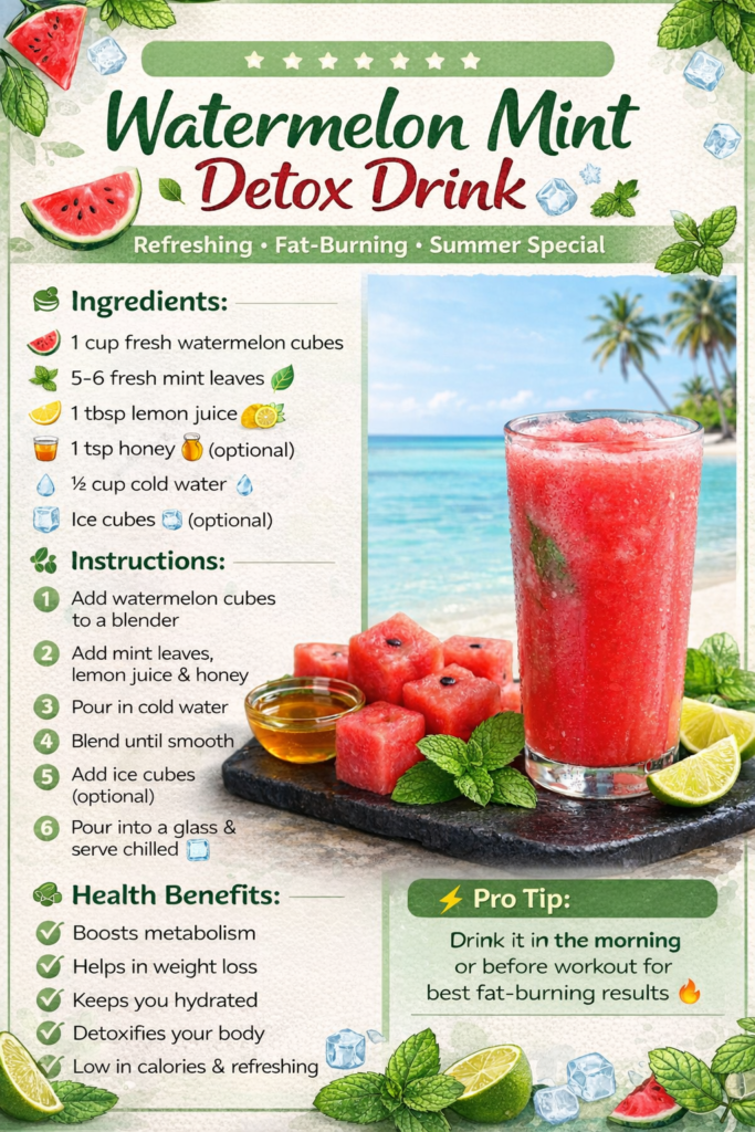 Looking for a refreshing and natural way to boost your metabolism and stay hydrated this summer? This watermelon mint detox drink is the perfect solution. If you’re also interested in natural fat-burning drinks, you may want to read our detailed guide on green tea health benefits, which explains how green tea supports weight loss and overall wellness.